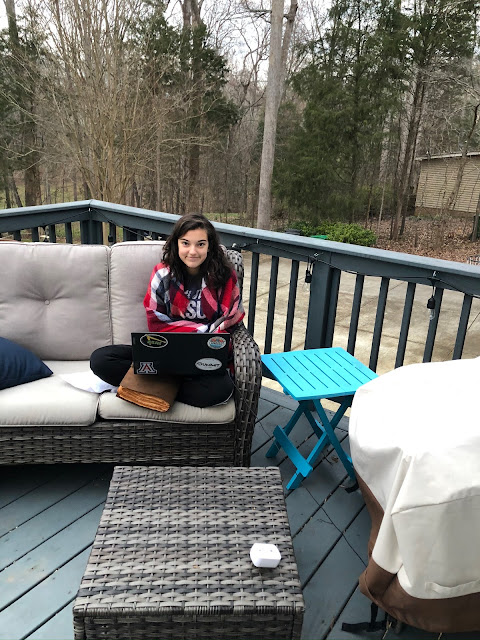 It's still a little chilly outside but that hasn't stopped Amy from doing some writing on the deck.